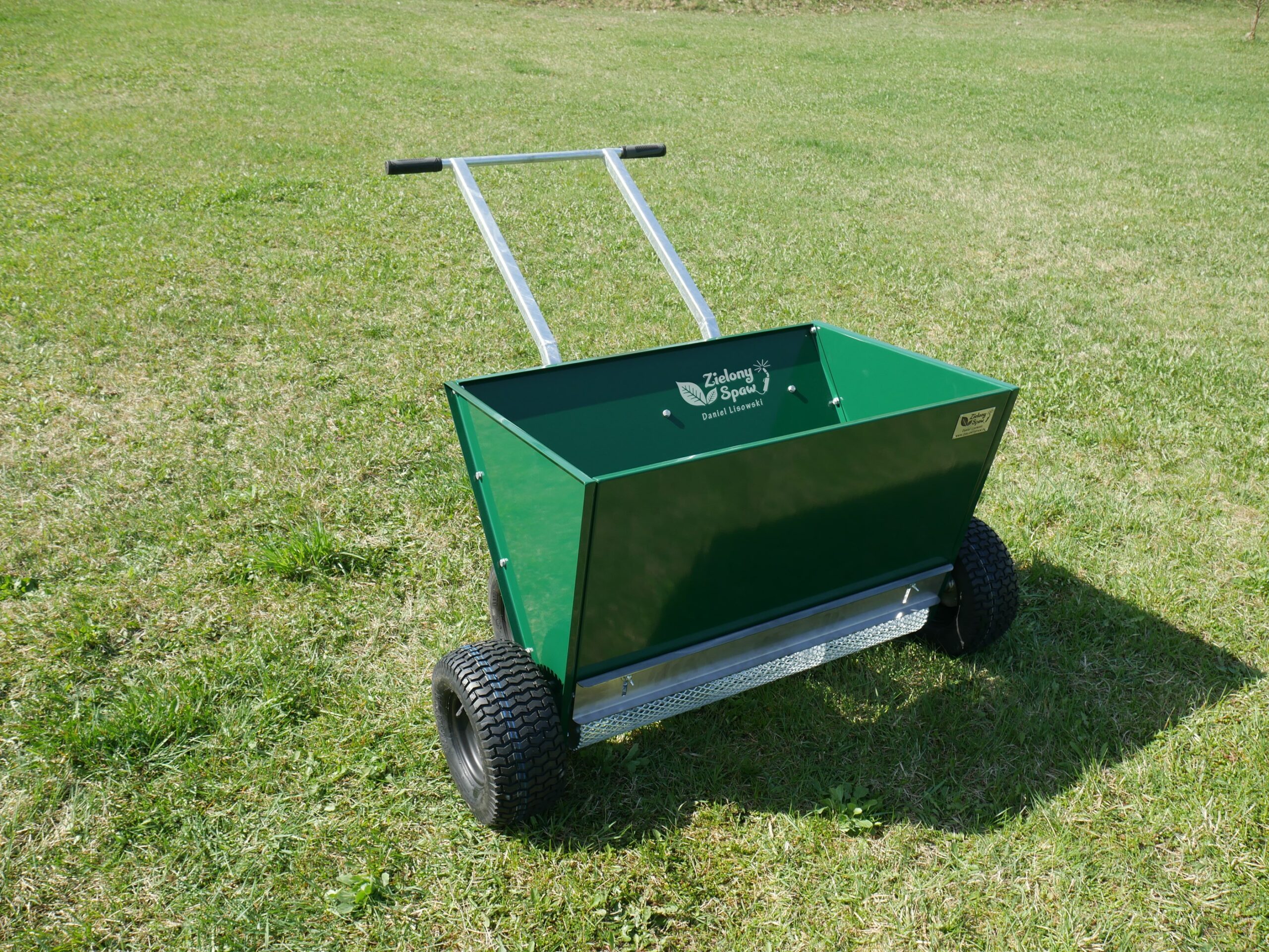 Koła są pompowane oraz osadzone na solidnych łożyskach. Siatkowy walec rozsypujący jest ocynkowany. Zasobnik jest zrobiony z grubej blachy wycinanej laserem i giętej na prasie krawędziowej, a na koniec malowany jest proszkowo.